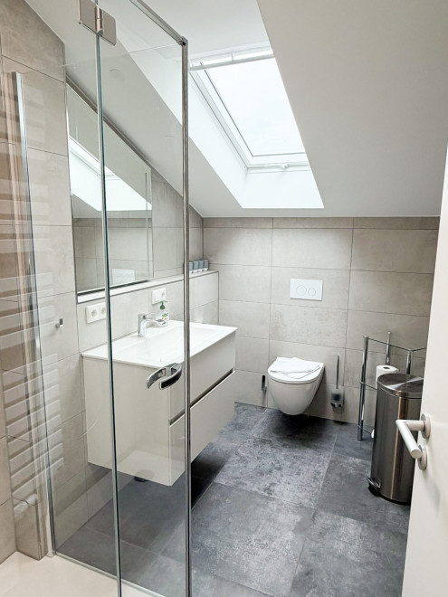 Das Badezimmer mit Fenster ist mit einer großen Dusche, WC, Waschbecken und einem Fön ausgestattet.